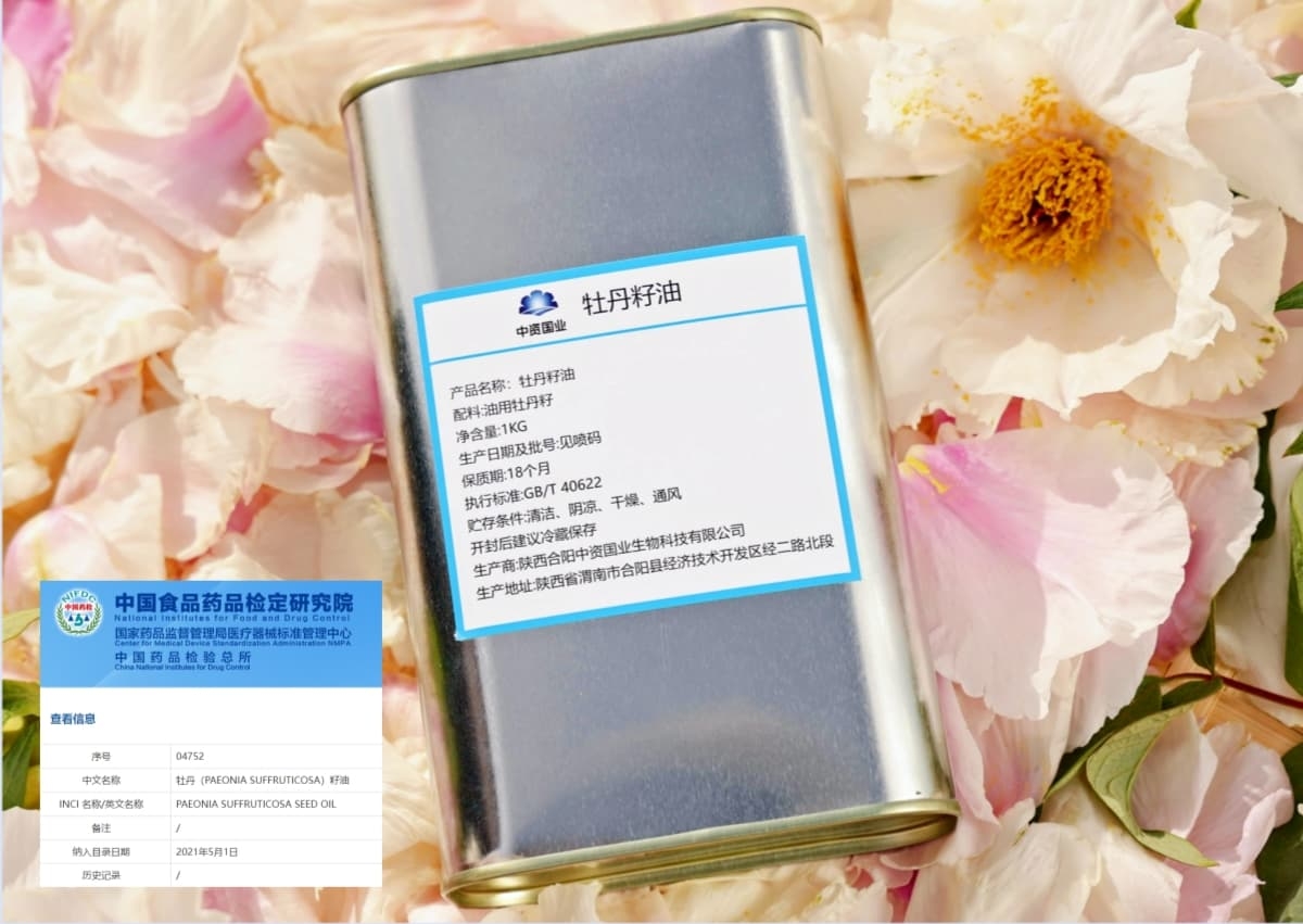 中资国业生产的牡丹籽油,油脂色泽清亮无杂质,不饱和脂肪酸≥90%,α-亚麻酸≥42%,质量达到国家一级牡丹籽油标准,是名副其实的“妆食同源”代表性原料,也是众多高端化妆品、护肤品品牌的长期信赖之选。