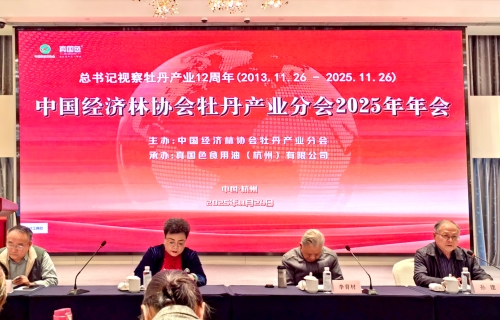 此外,中国经济林协会牡丹产业分会2025年年会同期开幕,中资国业董事长林奋、产品经理王杰琼、市场总监蔡菜参会。