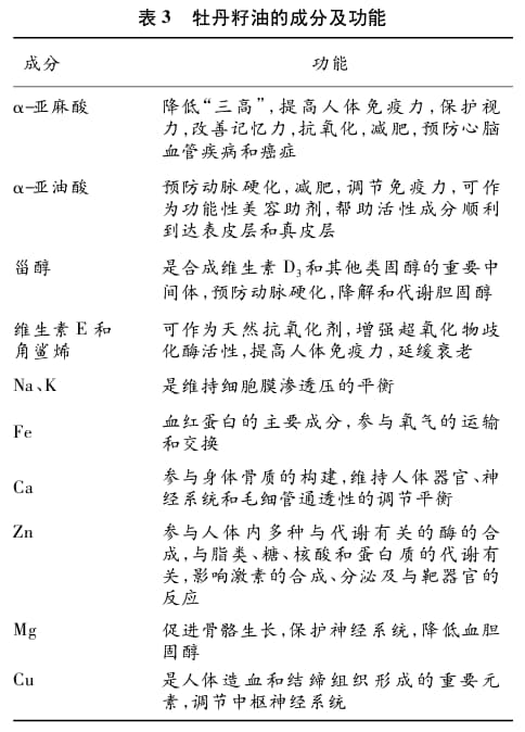 牡丹籽油富含维生素E、丹皮酚等抗氧化物质,能有效清除体内自由基[7],维持细胞活力,延缓机体衰老。
