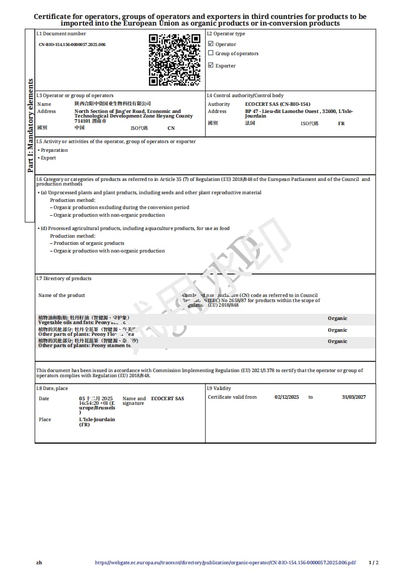 作为牡丹产业价值的创新者与推动者、牡丹产业的标杆企业、牡丹产业分会的副会长单位、《牡丹籽油》国家标准的参与制订单位,中资国业从2012年起持续深耕牡丹领域,公司在陕西合阳拥有21760亩自有油用牡丹种植基地,并连续多年通过中欧美三方有机认证,从源头确保了牡丹籽油的品质,保证每一滴植物Omega-3入口都是天然无污染的。